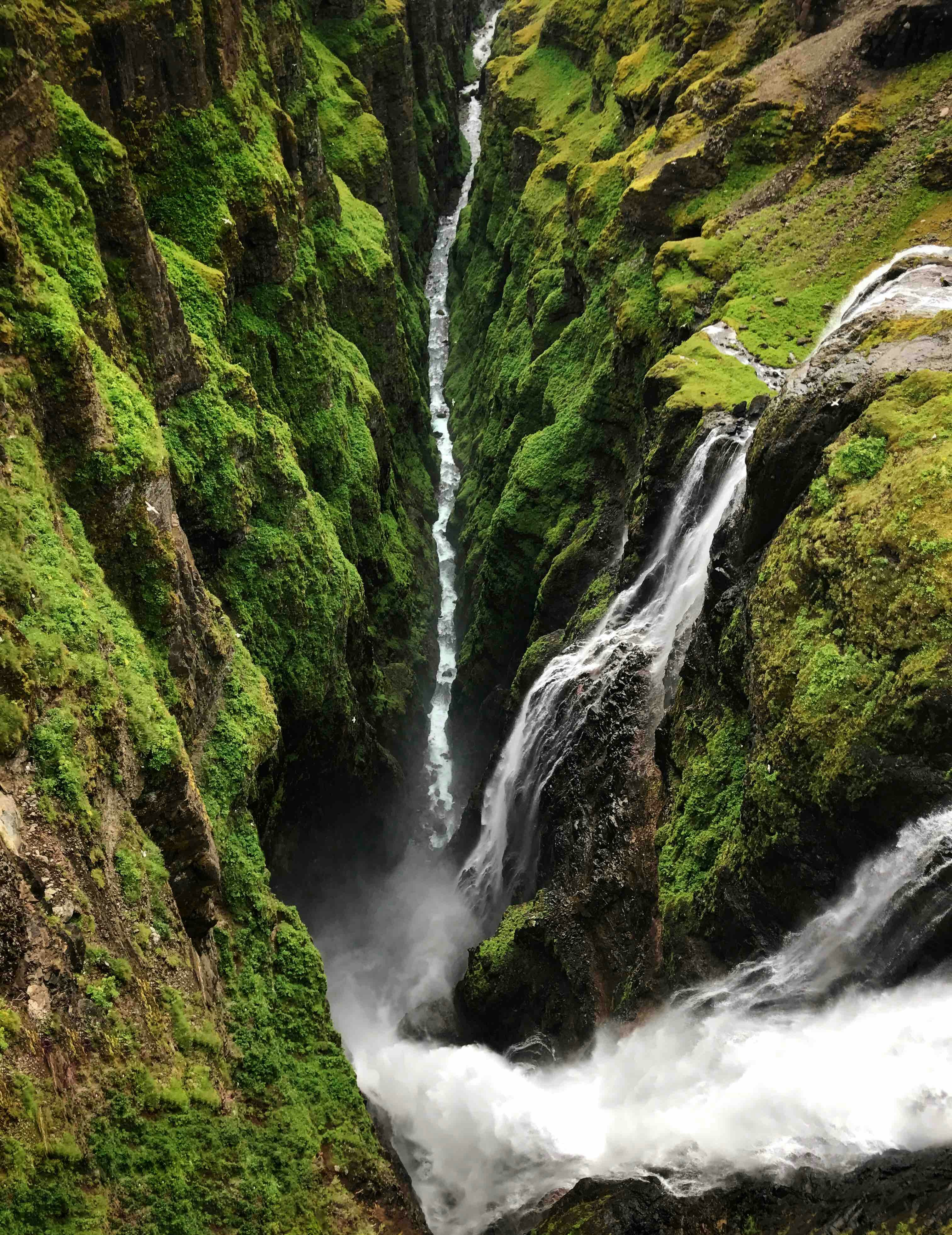 Самый высокий водопад в Исландии грациозно спускается лентами струй воды с 200 метров в массивный каньон, щедро украшенный зелёным мхом. Водопад Glymur, расположенный недалеко от Хваль-фьорда, связан с легендой о мифическом ките, доплывшем по нему до озера на вершине, где, как ни странно, были найдены кости этого животного.